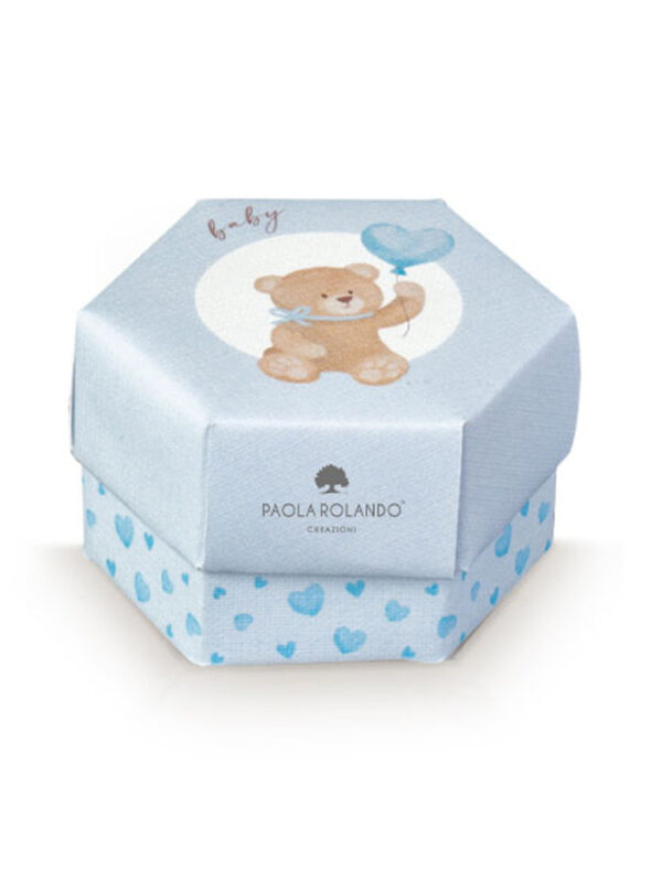 €3,30€1,65 IVA incl.Box cubetto azzurro con orsetto “Boy” con logo Paola Rolando Creazioni: questo articolo è realizzato e assemblato a mano da maestri artigiani italiani – dimensioni: 5x5x5 cm – 100% carta – abbinabile: confezione 5 pz. confetti gusto mandorla o confezione semi fioriti misti (10gr).