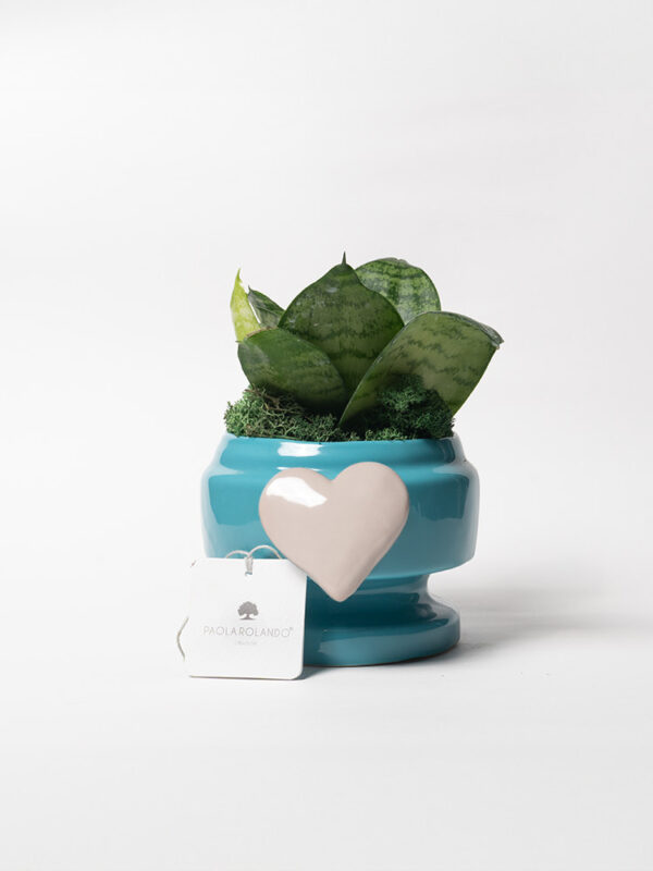 Sansevieria nana in vaso Eden con decoro cuoricino in ceramica Made in Italy con muschio vero stabilizzato: questo articolo è realizzato e smaltato interamente a mano da maestri artigiani italiani – dimensioni: d. 12 cm – h. 23 cm (l’altezza può variare in base alla pianta) – box o shopper da confezione abbinabile – dimensioni box: 15x15x12 cm – dimensioni shopper: 22x10x22 cm.