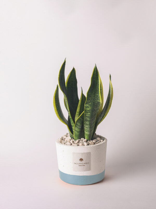 Sansevieria in vaso bianco e fascia colorata: questo articolo è realizzato e decorato interamente a mano da maestri artigiani – dimensioni: d. 14 cm h. 35 cm (l’altezza può variare in base alla pianta) – 100% cementino – box o shopper da confezione abbinabile – dimensioni box: 15x15x12 cm – dimensioni shopper: 22x10x22 cm.