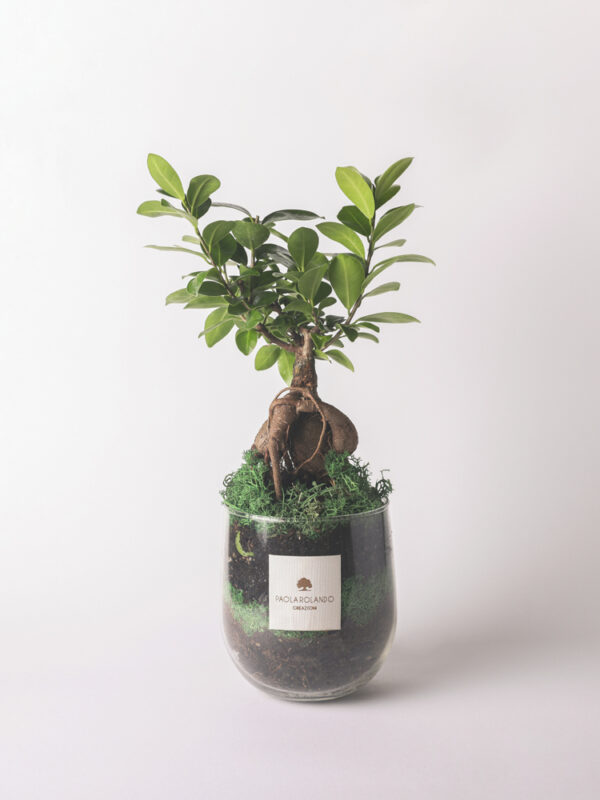 Bonsai ficus ginseng in vaso Hope di vetro con muschio vero stabilizzato e terreno: questo articolo è realizzato interamente a mano da maestri artigiani italiani – dimensioni: d. 14 cm h. 35 cm (l’altezza può variare in base alla pianta) – box o shopper da confezione abbinabile – dimensioni box: 15x15x12 cm – dimensioni shopper: 22x10x22 cm.